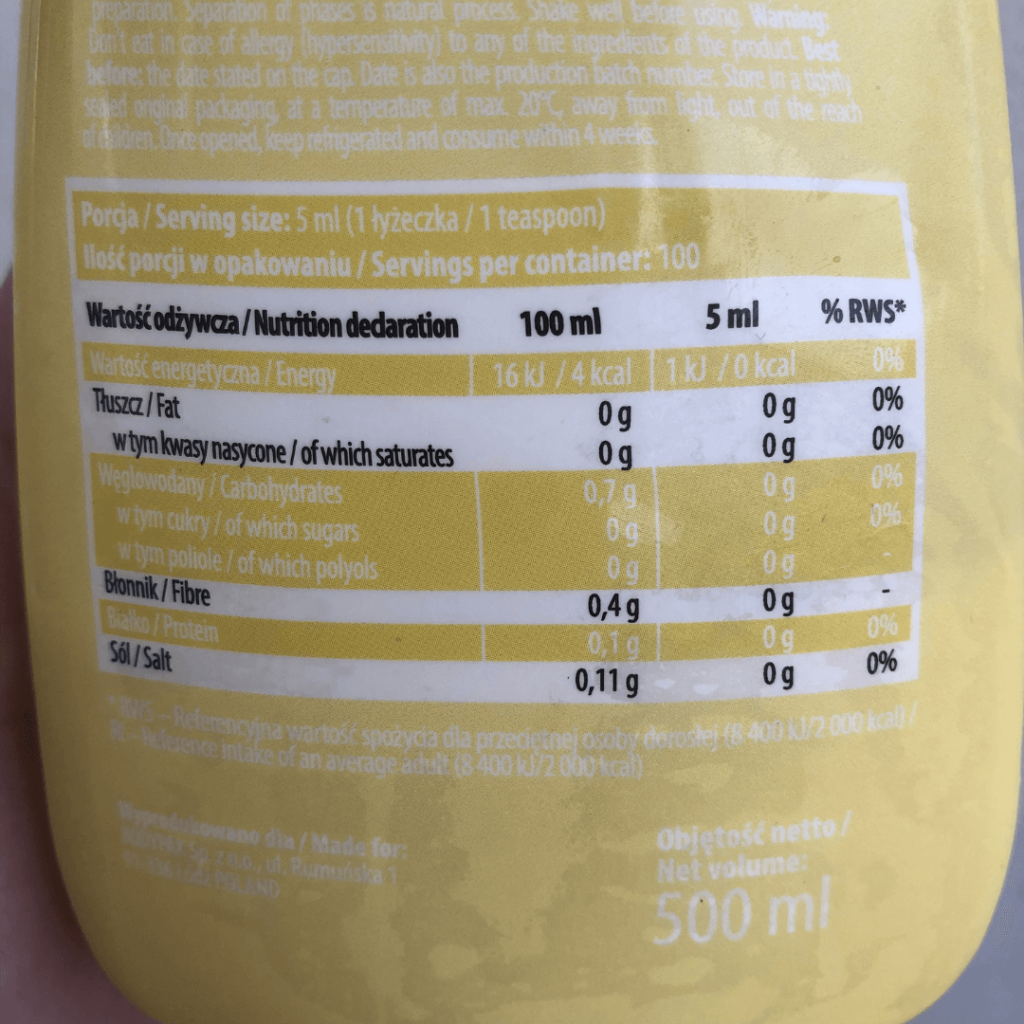 Podczas próbowania solo można wyczuć charakterystyczny posmak syropów zero (podobny do syropów na przeziębienie), jednak delikatnie. Jedzony w towarzystwie czegoś jest to niewyczuwalne.