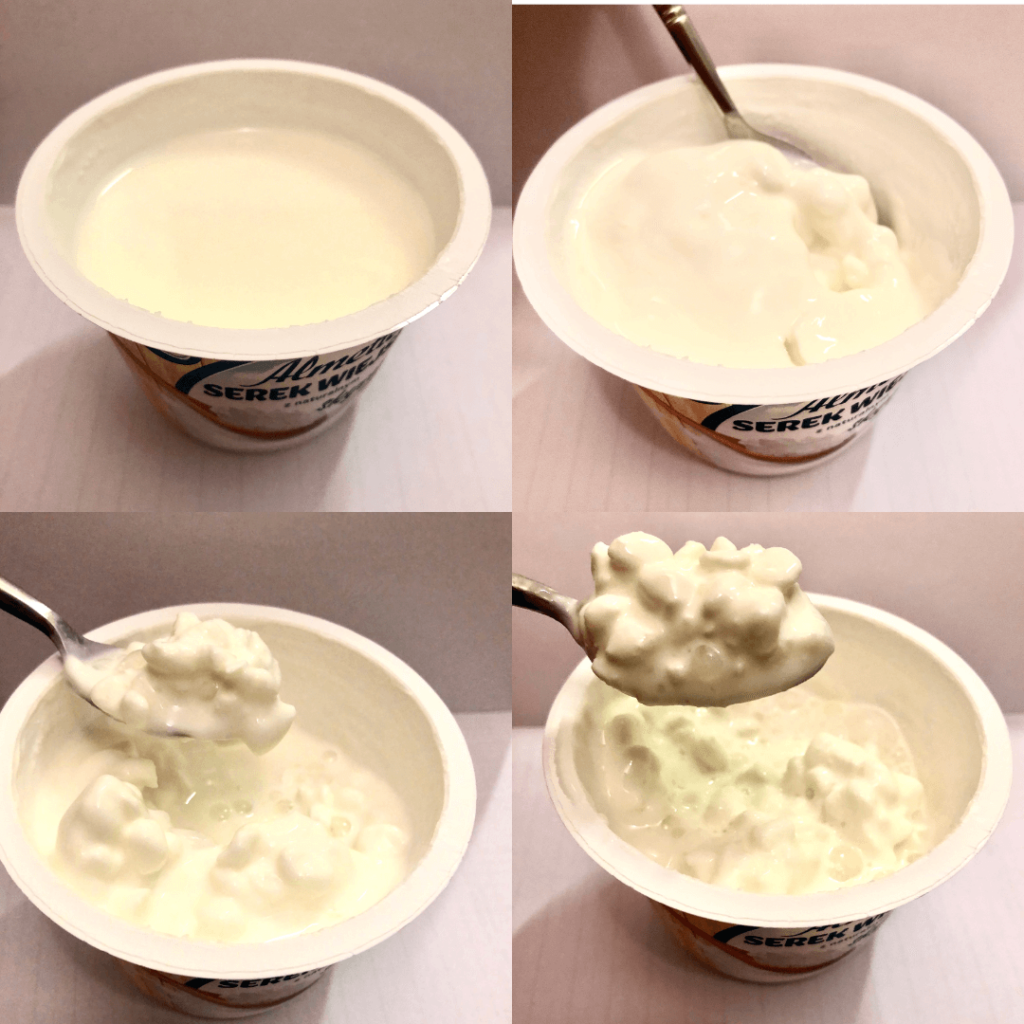 Po zerwaniu wieczka uświadczymy taflę „śmietanki”. Jest ona nieco rozwodniona, rzadsza niż w zwykłym serku wiejskim.