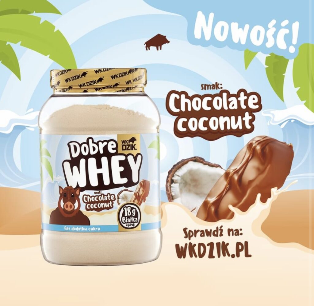 Dobre Whey Chocolate Coconut marka WK DZIK wprowadziła do swojej oferty nowy smak białka Dobre Whey, a jest to czekolada z kokosem!