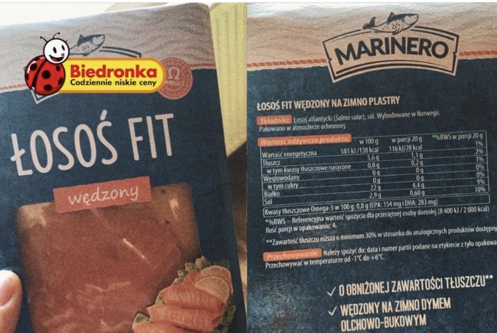 W lipcu również w Biedronce pojawił się Fit Łosoś Wędzony! Posiada 30% mniej tłuszczu w 100g od tradycyjnego łososia! Jest to łosoś wędzony na zimno dymem olchowo-bukowym.