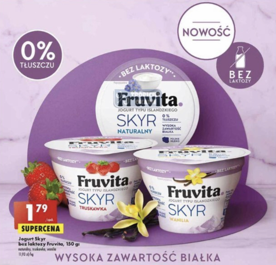 Skyr Fruvita bez laktozy – w końcu doczekaliśmy się popularnego jogurtu typu islandzkiego o świetnym makro w wersji bez laktozy! Cena jest całkiem w porządku (1,79g za 150g opakowanie).
