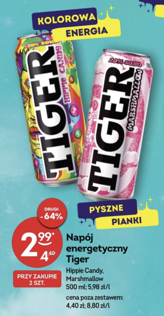 Napój energetyczny Tiger 20% soku Hippie Candy oraz Marshmallow