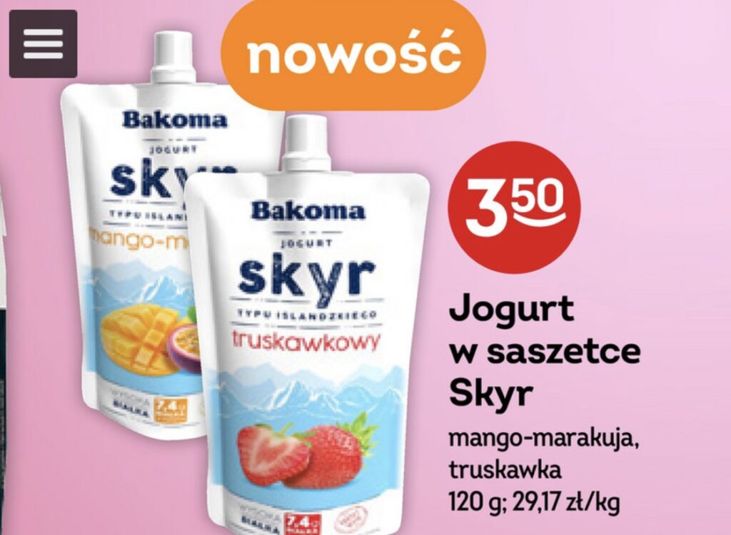 Skyr w wygodnym opakowaniu, jednak posiada cukier w składzie oraz zawiera 6,2g białka.