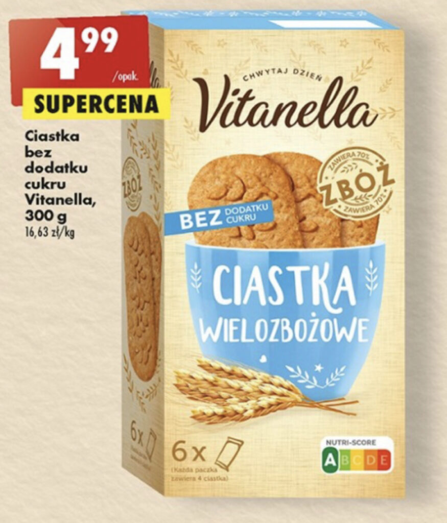 Pojawią się ciasteczka wielozbożowe, bez dodatku cukru! Mają 70% zbóż! Opakowanie 300g zawiera 6 paczek po 4 ciastka. Cena to 4,99 zł.