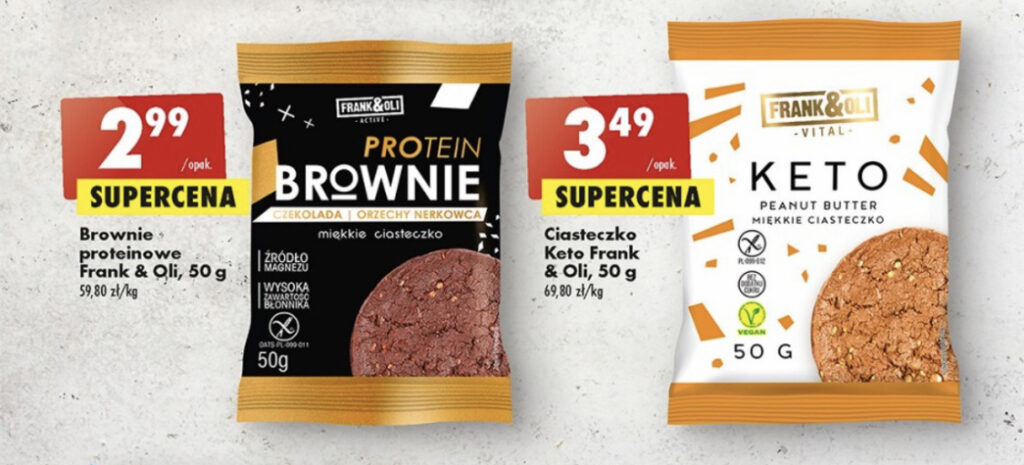 Pojawią się do wyboru 2 przekąski od Frank & Oli! To brownie proteinowe: Protein Brownie czekolada i orzechy nerkowca oraz keto ciasteczko peanut butter! Oba mają 50g. Cena brownie to 2,99 zł, a keto ciastka to 3,49 zł.