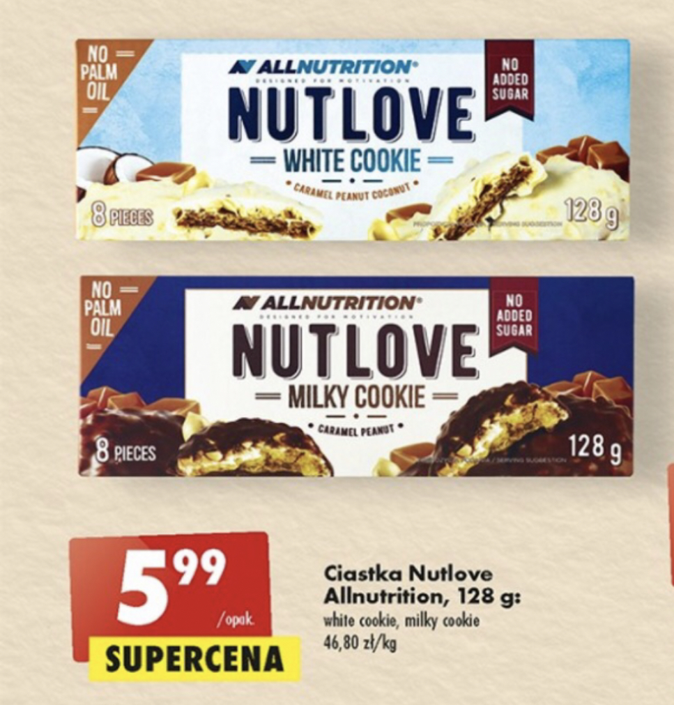 Produkty od AllNutrition ponownie zawitały do Biedronek! Tym razem to ciastka Nutlove Milky Cookie oraz White Cookie! Więcej o tych ciasteczkach przeczytasz w tym wpisie. W Biedronce można je zakupić w cenie 5,99 zł za opakowanie 128 g.