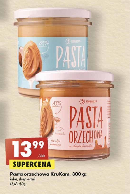 Na Biedronkowych pólkach pojawią się pasty orzechowe firmy KruKam w dwóch smakach: kokosa oraz słonego karmelu! Cena za słoik 300g to 13,99 zł.