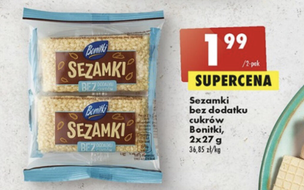Sezamki Bonitki bez dodatku cukrów pojawią się dwupaku po 27g w cenie 1,99 zł.