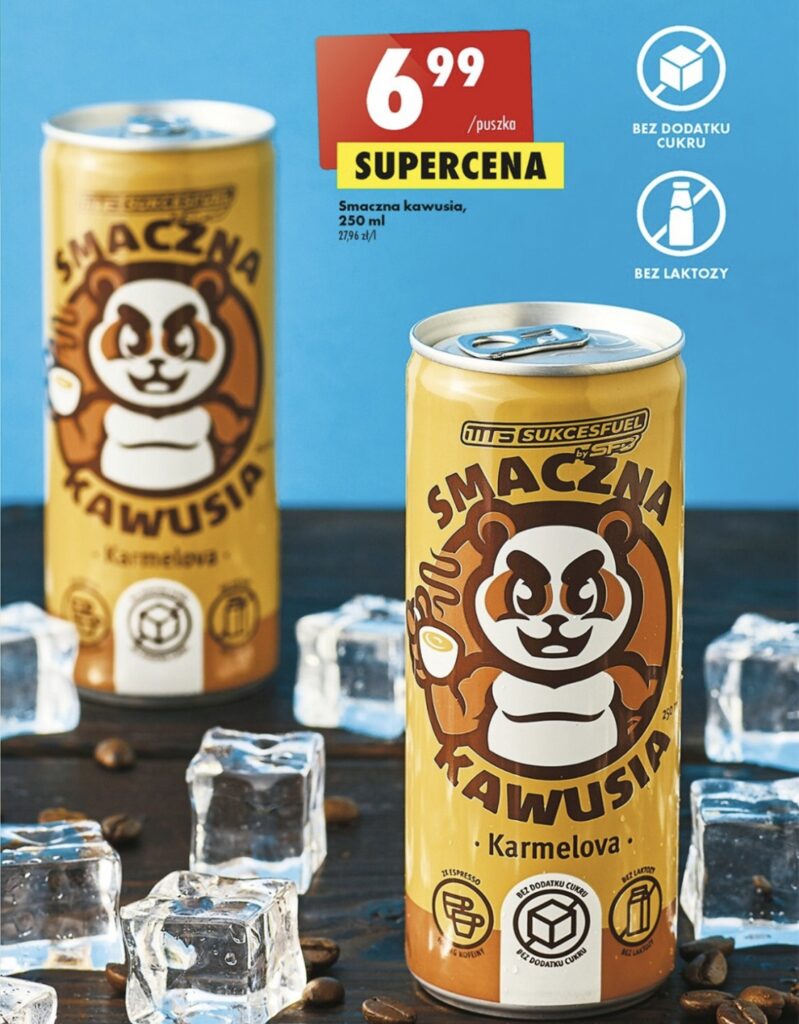 Jedna z najciekawszych fit nowości, które pojawią się w Biedronce! To zapowiadana 8 sierpnia Smaczna Kawusia Karmelova od Kizo! Ma 100g kofeiny, nie zawiera cukru i laktozy! Jej cena to 6,99 zł za puszkę 250 ml