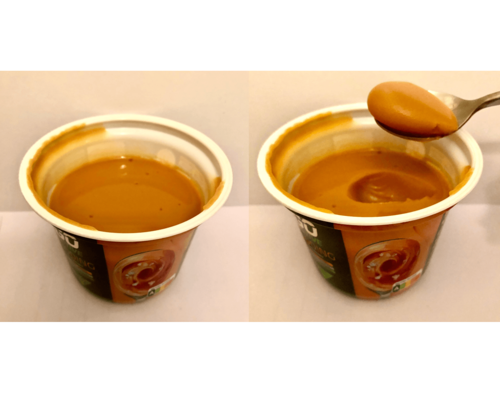 Po zerwaniu wieczka uświadczymy idealnie gładką, jednolitą, błyszcząca tafle puddingu. Jest sztywny, zbity niczym deser na żelatynie, ani nie drgnie po przechyleniu kubeczka. Nabrany na łyżeczkę nie spływa z niej.
