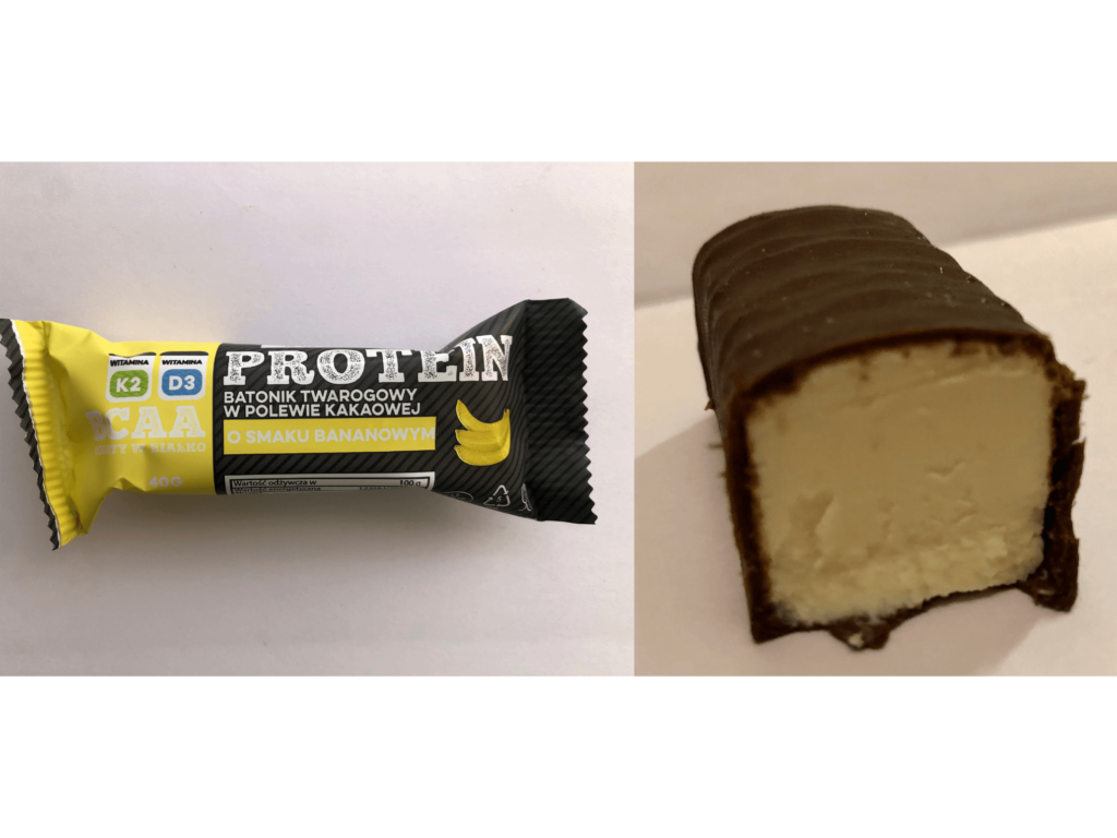 Masa twarogowa jest oblana nie czekoladą, a niestety polewą. W konsystencji idzie to szybko wyczuć, gdyż w ustach rozpuszcza się bardzo szybko i „wodniście”. Po ugryzieniu zaś kruszy się i odpada. Sam środek batona, czyli masa twarogowa w strukturze przypomina sernik! Jest zbita, ale też lekko gąbczasta. Nieco skleja zęby. Czuć „proteinowość”. Generalnie jest przyjemna w jedzeniu i nie mam do niej żadnych zarzutów.