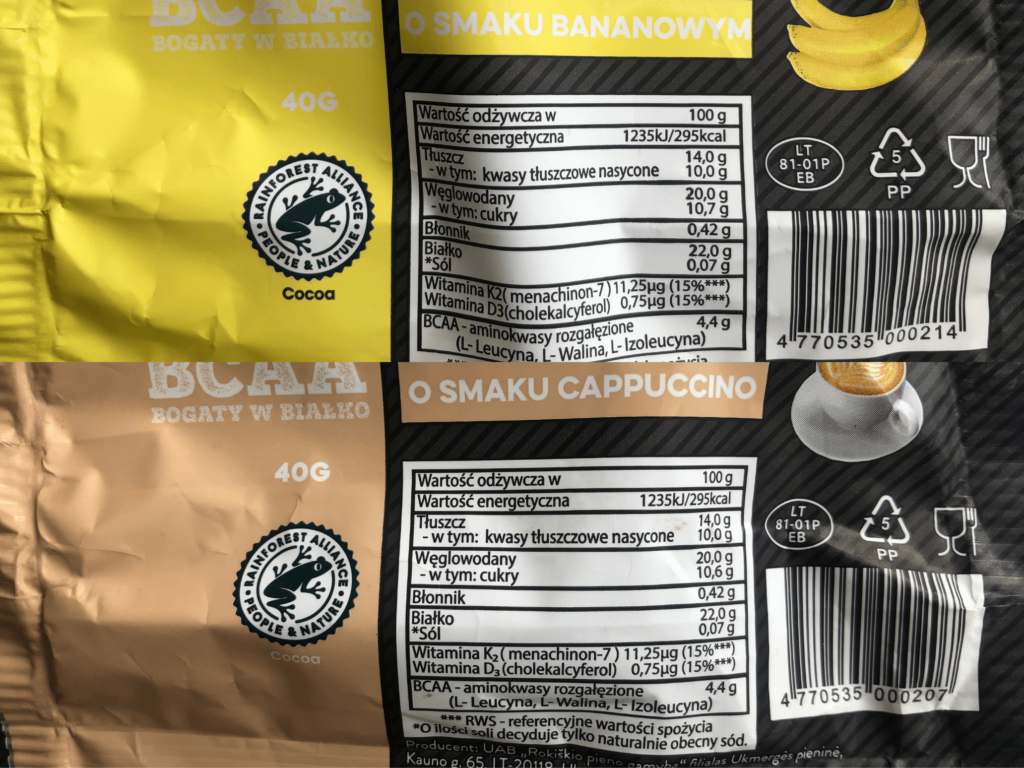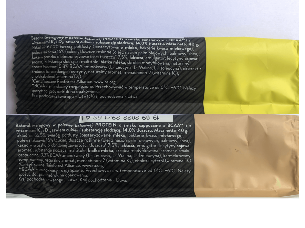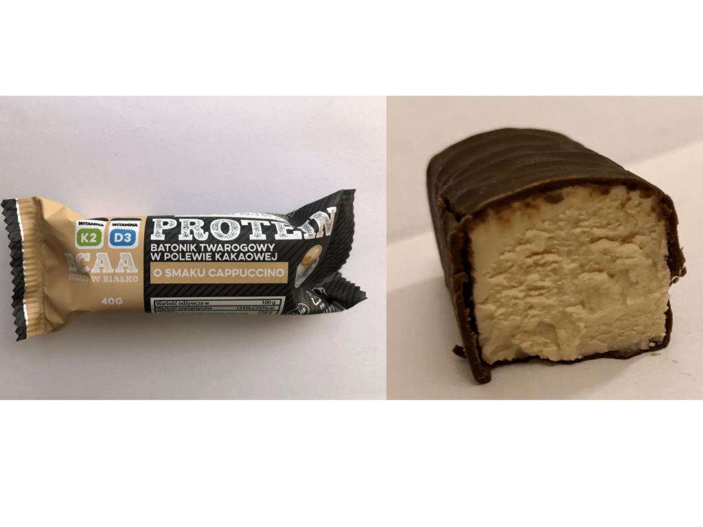 Składu i makro nie mają idealnego, są oblane wstrętną w mojej opinii polewą kakaową (na czymś trzeba było przyoszczędzić). Gdyby były oblane prawdziwą czekoladą zyskałyby dużo na smaku i konsystencji. Wariant bananowy wypadł średnio, jednak cappuccino jest nieco lepszy i przypomina mi tiramisu. Oba smaki cechują się delikatnym i niezbyt słodkim smakiem oraz delikatną kwaskowatością.