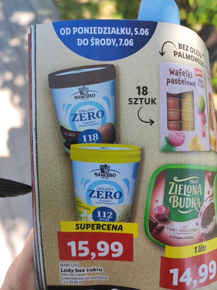 Nowość, która poszerzy ofertę produktów bez dodatku cukru w Lidlu oficjalnie dostępna będzie w gazetce Lidla od poniedziałku, 5 czerwca do środy, 7 czerwca. Za pudełko włoskich lodów Mancuso o pojemności 400 ml zapłacimy 15.99 zł. Wrzucicie je do koszyka?
