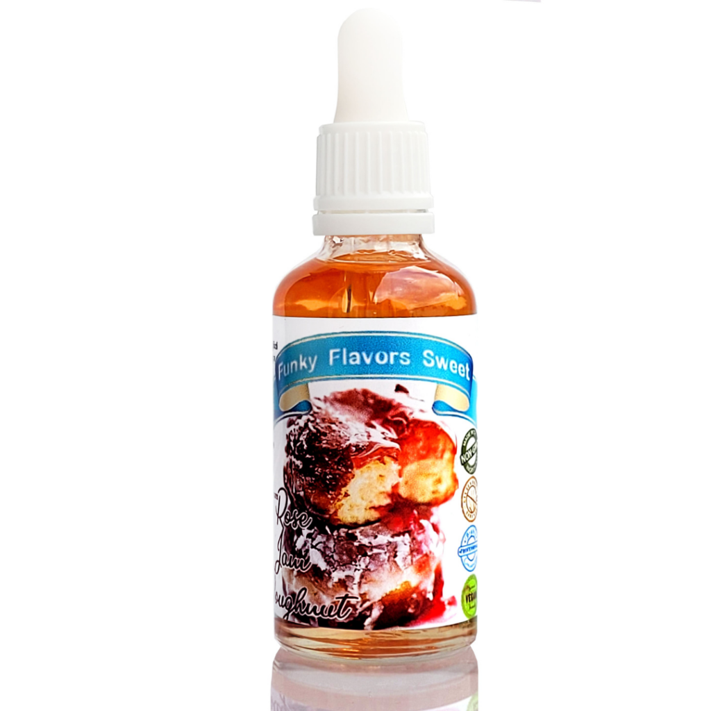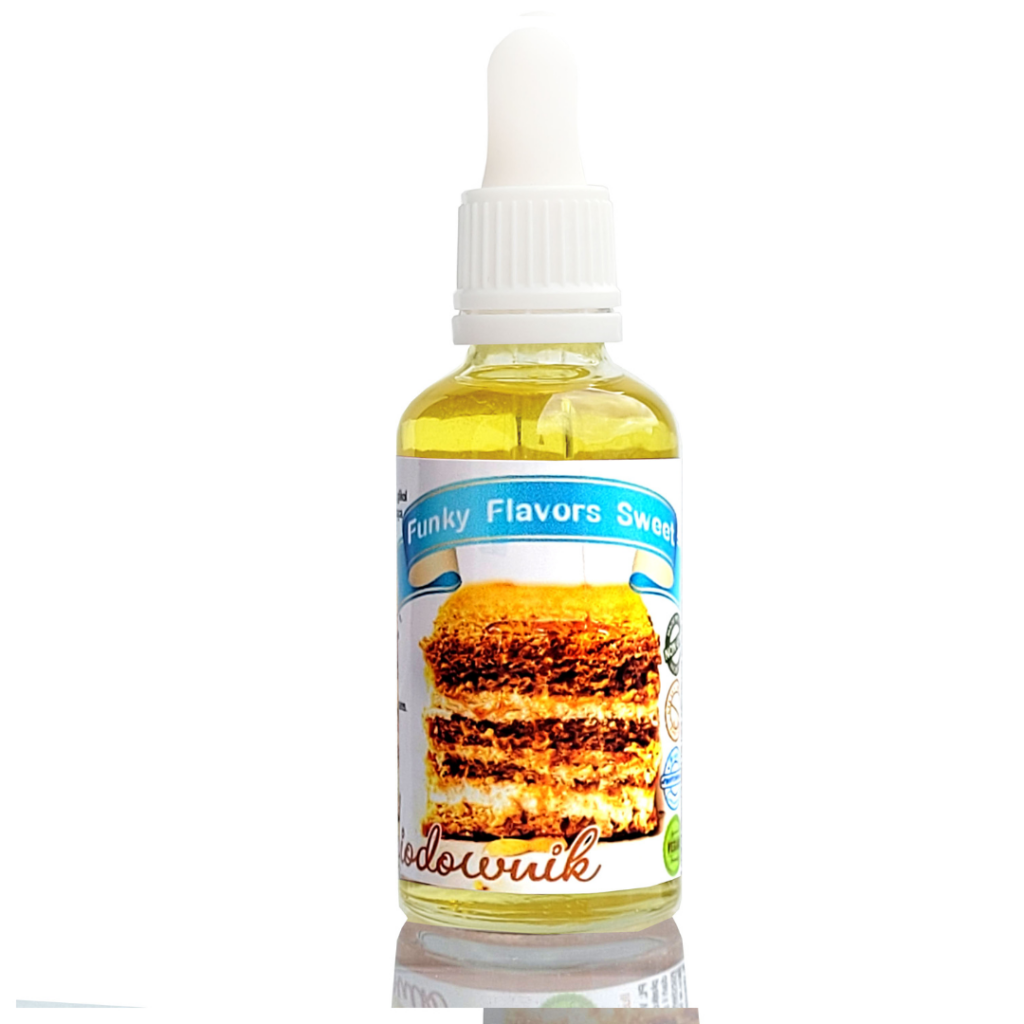 Aromaty Funky Flavors Sweet nie zawierają cukru i tłuszczu. Nie posiadają wartości energetycznej, a swój słodki smak zawdzięcza sukralozie w składzie.