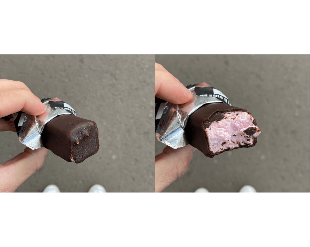 Jest niewielki, oblany polewą kakaową (nie czekoladową!), która łatwo odpada. Jest miękka. W ustach rozpuszcza się błyskawicznie i na „zero”, ze prawie jej nie czuć. Na pochwałę zasługuje natomiast środek. Jest miękki i ma gąbczastą strukturę. Mi przypomina nieco sernik na zimno.