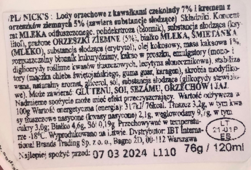 Producent od razu informuje nas o smaku, kaloryczności lodów, ze są bez dodatku cukru i oleju palmowego. Pod spodem ujrzymy przetłumaczenie składu i wartości odżywczych na język polski.