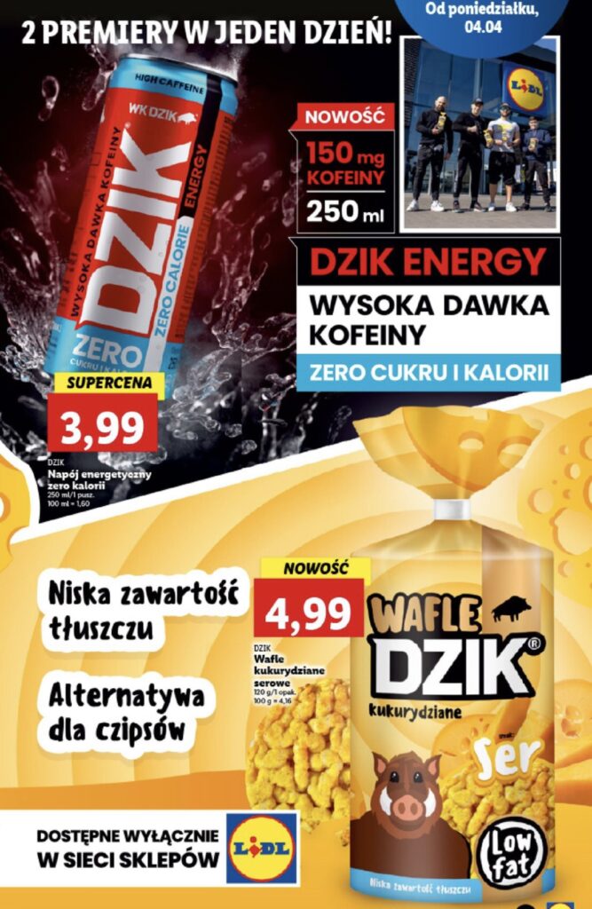 4 kwietnia w sklepach Lidl miała miejsce premiera dwóch nowości od WK DZIK: wafli kukurydzianych o smaku serowym oraz napoju energetycznym DZIK ENERGY w wersji 250 ml