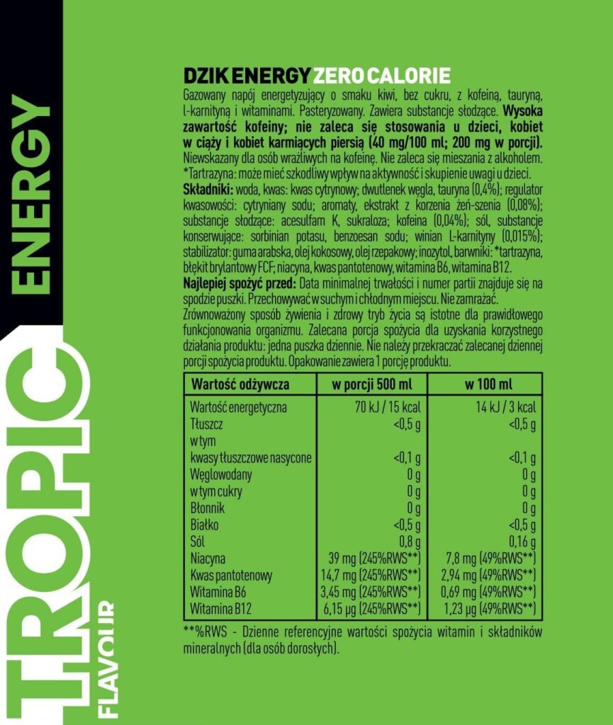 Napój energetyczny od WK nie zawiera dodatku cukru. Dzięki temu, wyróżnia się swoją niską kalorycznością. Puszka o pojemności 500ml, w każdej wersji smakowej dostarcza jedynie 15 kcal! Dodatkowo, Dzik Energy charakteryzuje się wyższą zawartością kofeiny, niż większość dostępnych na rynku energetyków – aż 200mg w puszcze! Napój od WK wzbogacony jest o taurynę, l-karnitynę, guaranę, ekstrakt z żeń-szenia oraz dawkę witamin: B2, B3, B6 i B12. Mimo, że Dzik Energy nie zawiera dodatku cukru, charakteryzuje się wyrazistym słodkim smakiem! To zasługa substancji słodzących – sukralozy i acesulfam’u K.