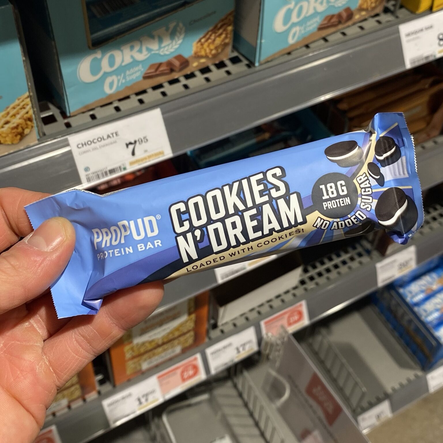 Choć batony tej marki dostępne są w kilku wersjach, naszą uwagę przykuł smak Cookies n’ Dream czyli smak ciasteczek Oreo. Baton PROPUD to kakaowa masa z kawałkami ciasteczek oblana warstwą białej czekolady. Cookies n’ Dream dostarcza 235 kcal i 18g białka. Nie zawiera cukru i oleju palmowego.