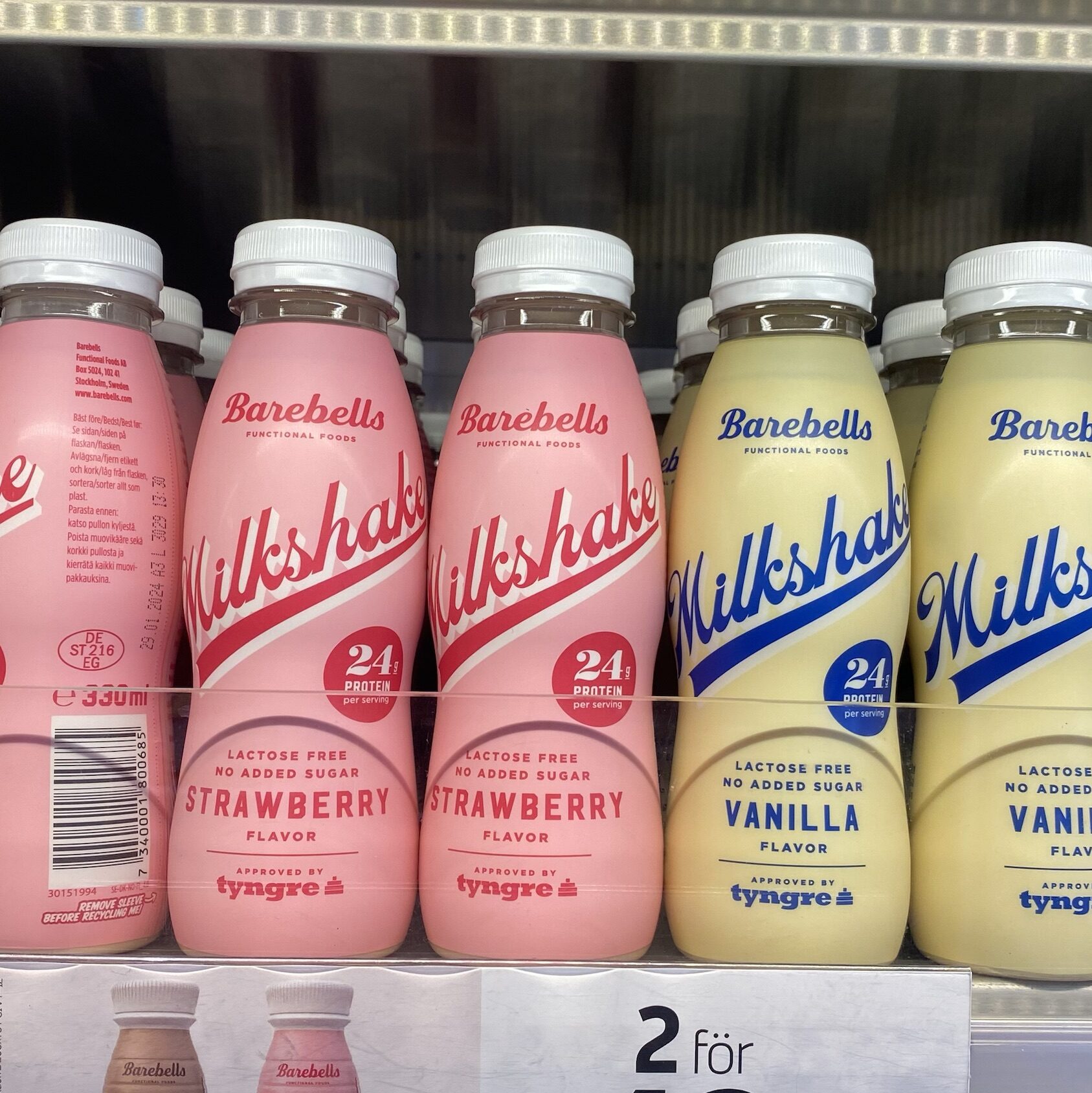 W szwedzkich sklepach znajdziemy także odtłuszczone napoje jogurtowe w kilku wersjach smakowych. Ich skład jest krótki, bazujący na naturalnych składnikach, m.in. mleku, białkach mleka i przecierze owocowym. Nie zawierają dodatku cukru, a rolę substancji słodzących pełni sukraloza i acesulfam K. Butelka Protein Drink o pojemności 300g dostarcza około 150 kalorii i aż 25g białka!